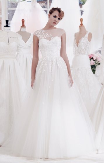 Robe bustier cœur sur une large jupe, le tout réalisé en tulle brodé à motifs de feuilles de Robinier de la maison Potencier en exclusivité pour la maison Atelier Emelia.