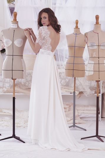 Robe fluide en crêpe de soie, touché peau de pêche. Buste décolleté en dentelle de Calais, transparence dans le dos et manches pagodes.