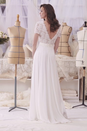 Longue robe fluide en mousseline, buste en Guipure, manches courtes et profonds décolletés devant et dos. La guipure est créée en exclusivité par la maison Potencier pour Atelier Emelia.
