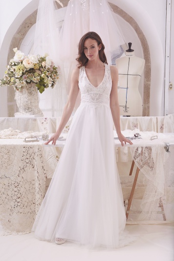 : Robe fluide réalisée en tulle plume, buste en tulle brodé décolleté bain de soleil et bretelles croisées dans le dos en organza de soie.