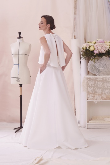Ensemble composé de la jupeLENNINE, longue à poches à taille haute découpes princesse en sergine, et le top LÉO,en Sergine ras du cou évasé avec ouverture dans le dos.