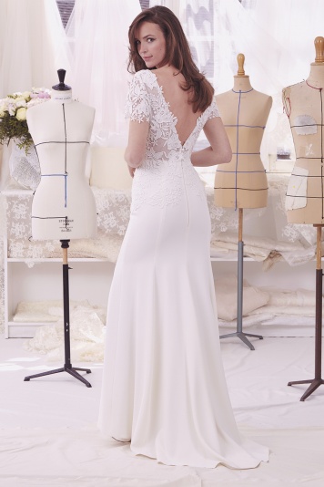 Robe fourreau en crêpe fendue sur un côté, buste en guipure, manches courtes.