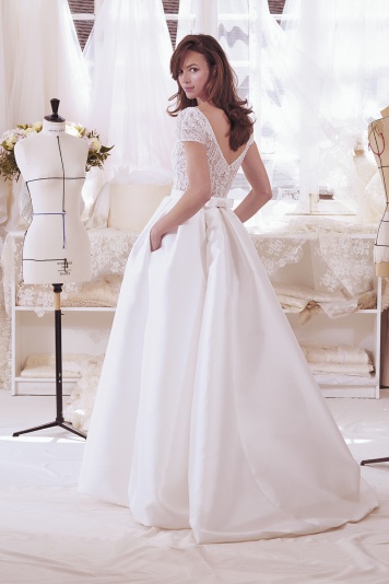 Robe composée d’un buste de dentelle de Calais décolleté «V» devant et dos et large jupe à poches de Mikado de soie.