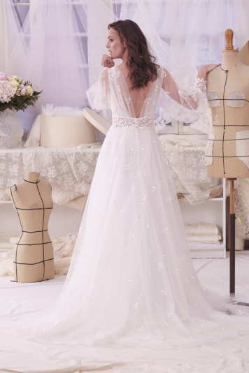 Robe esprit bohème en tulle brodé, manches longes chemisier. Le tulle brodé est réalisé en exclusivité par la Maison Potencier pour Atelier Emelia.