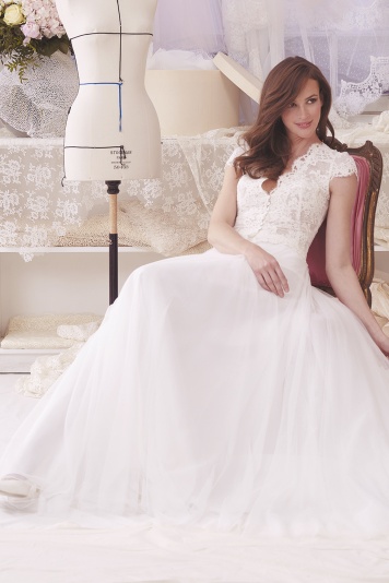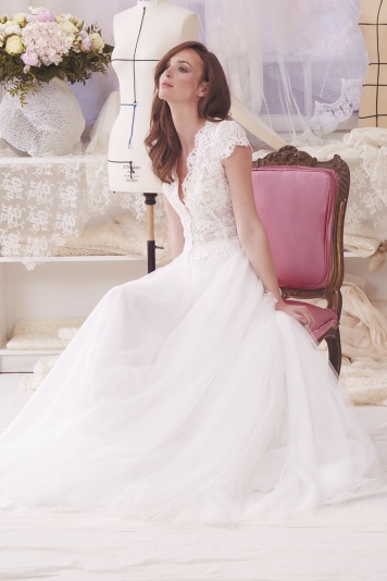 Top manches courtes en dentelle de Calais profond décolleté «V». Jupe fluide en tulle plume.