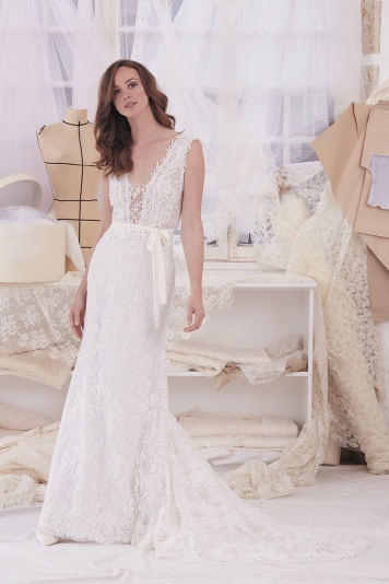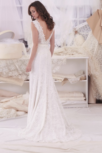 Robe fourreau fluide réalisée en dentelle de Calais, profonds décolletés devant et dos.Motifs de guipure Potencier, appliqués sur les bretelles et parsemés sur le décolleté.