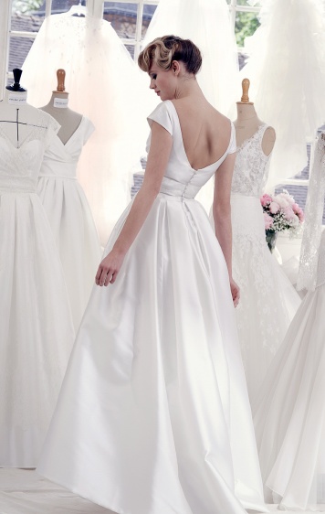 Low neckline draped wrap style dress, an a line skirt with pockets in Mikado silk. Bodice topstitched in saddle stitch.