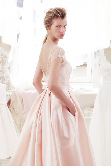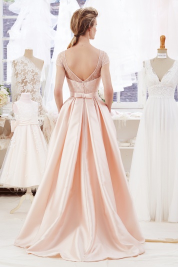 Bodice in Calais lace plunging neckline, back of bodice closed by small buttons and wide skirt in mikado silk . Waist encircled by a bias of mikado silk. Also available in ivory.