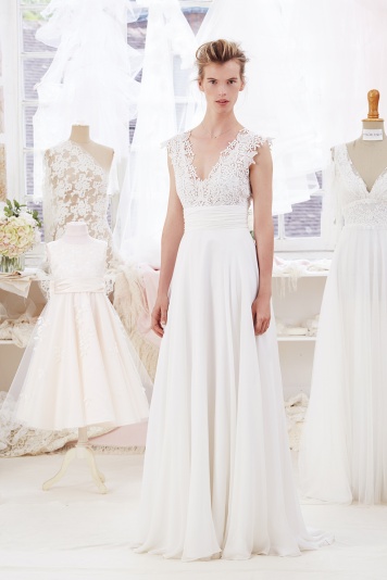 Long dress, dancer style skirt in Silk chiffon, bodice with guipure motifs from the house of Potencier designed exclusively for Atelier Emelia.