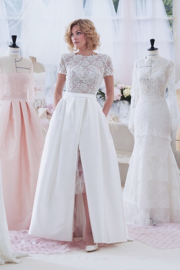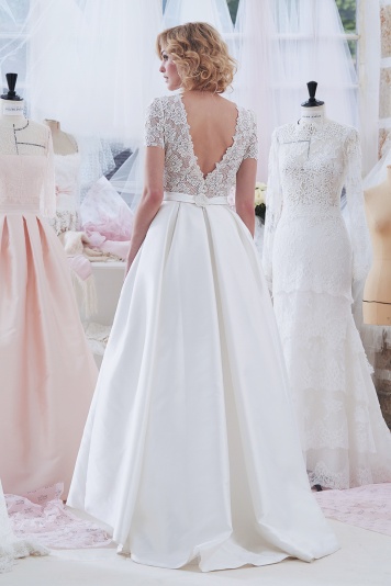 Ultra chic dress, bust neckline crew-necked, deep neckline back with small sleeve. Wide split skirt in silk mikado.