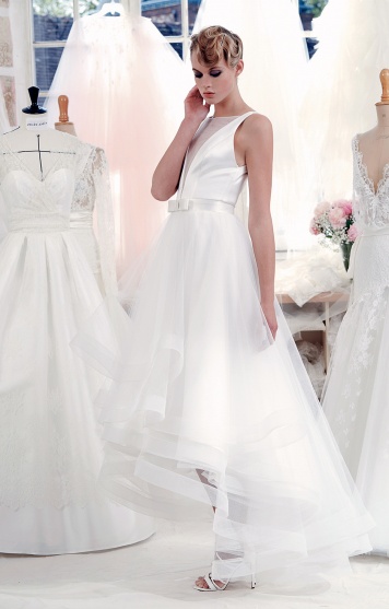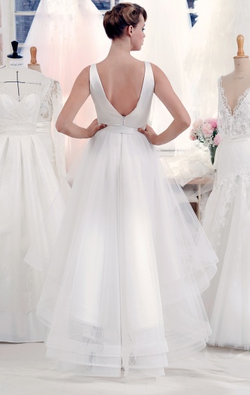 Gown short at the front and long at the back, the tulle has a horsehair border and the bodice is created in satin with a very “on trend” deep plunging neckline at the front and a deep plunging neckline at the back
