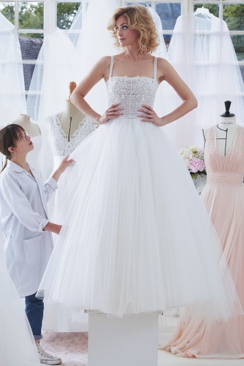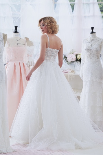 Straight bust with fine straps in tulle plumetti, underlined with bands and embroidered tulle. Wide plumed tulle skirt.