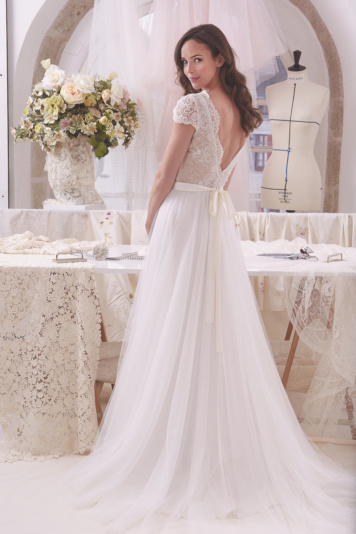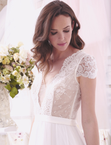 CLÉMENTINE:Fluid dress made of chiffon and Valence embroidered tulle, with a “V” necklines in front and back and short sleeves.