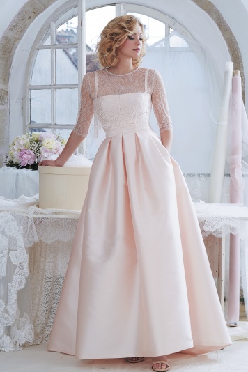 Two-piece set, straight neckline with thin strap and wide pleated skirt made of nude silk Mikado. Available in ivory.