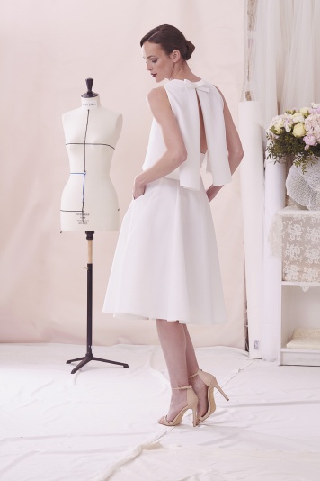Ensemble of the skirt LÉONIE, high waist, princess cut, short skirt with pockets made of sergine, and the top LÉO,sleeveless flared top in sergine tied in the neckline with a back slit.