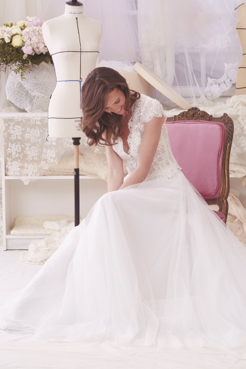 Short sleeve top in Calais lace with a deep “V” neckline. Feather tulle fluid skirt.